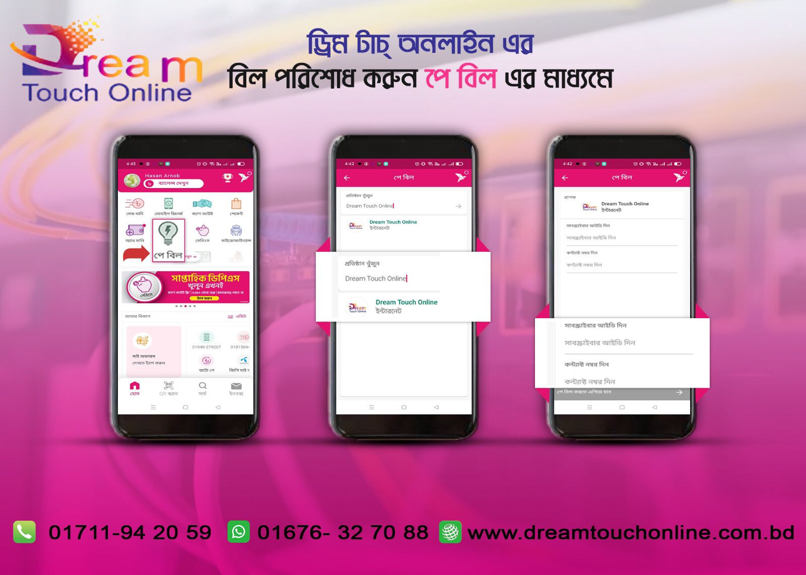 Subscribers can also visit any Bill payment/recharge Dream Touch Online point and pay the dues in cash. The designated Dream Touch Online point will process the payment and provide the subscriber with an authorized payment receipt.